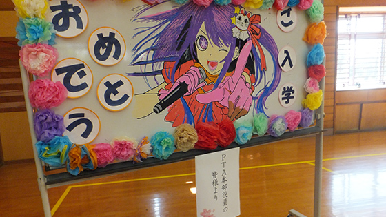 ※画像は、毎年PTA本部役員さんが、卒業式・入学式に向けてお祝いの絵を描いています。